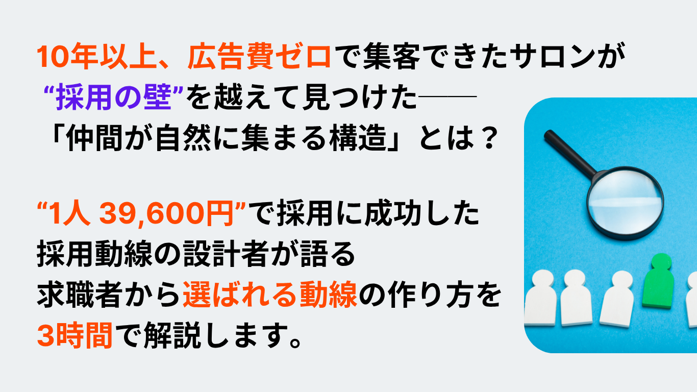 | 受講条件 | 採用に悩むすべてのサロン様 (メルココ未取扱・ココナッツ講習会未参加でも受講できます) zoom参加時は顔出し・申込名での参加をお願い致します |